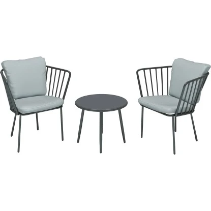 Dieses Balkonset eignet sich für den Balkon, Garten und die Terrasse. Für seine Fertigung wird robuster und langlebiger Stahl verwendet. Im Set enthalten sind zwei Stühle mit den Maßen 73 cm x 65,5 cm x 66,5 cm (H x B x T) und ein Tisch mit einer Höhe von 45,5 cm und einem Ø von 52,5 cm. Geliefert wird das Balkonset zudem mit Auflagen aus Polyspun, womit es einen angenehmen Komfort bietet.