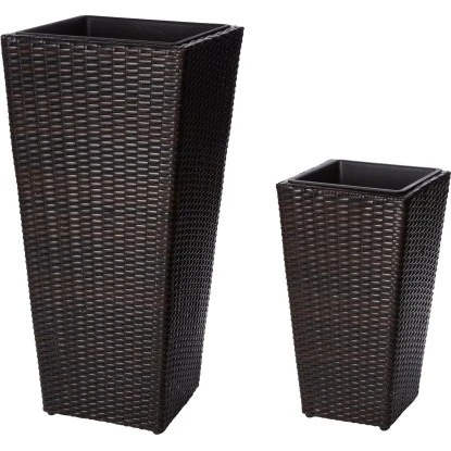 Das Pflanzkübel Polyrattan 2er Set eignet sich für den Innen- und Außenbereich und setzt dekorative Akzente im Haus, auf der Terrasse oder im Garten. Die Pflanzgefäße sind mit hochwertigem PE-Kunststoffgeflecht hergestellt, das über einen rostbeständigen Alu-Rahmen gewebt ist. Die Faser ist UV- und temperaturbeständig, langlebig und pflegeleicht. Die Kunststoffeinsätze können bequem außerhalb des Gefäßes bepflanzt und dann eingesetzt werden und bieten auch für größere Pflanzen ausreichend Platz. Gegenüber Einsätzen aus anderen Materialien bietet dieser den Vorteil, nicht zu rosten und absolut wasserdicht zu sein. Bei Außenaufstellung einfach ein Loch in den Boden bohren, um Staunässe zu vermeiden.