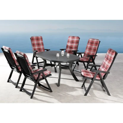 Die Gartenmöbelgruppe Santiago Kansas 13-tlg. in Anthrazit besteht aus sechs Klappsesseln, sechs Polsterauflagen und einem Tisch. Die Klappsessel bestehen aus stabilem Vollkunststoff (100 % Polypropylen) und sind daher absolut wetterfest, UV-beständig und pflegeleicht. Sie sind platzsparend zusammenklappbar und die Rückenlehnen lassen sich 4-fach verstellen. Der elegante Tisch besteht ebenso aus stabilem Vollkunststoff (100 % Polypropylen). Die dickwandige Materialstärke und das geschwungene Gestell sorgen für eine hohe Standfestigkeit. Die Plattenoberfläche ist matt-sandgestrahlt und daher kratzunempfindlich. Zudem besitzt die Tischplatte in der Mitte ein praktisches, bei Bedarf abdeckbares Schirmloch. Der Tisch ist absolut wetterfest, UV-beständig und pflegeleicht. Die 6 cm starken Polsterauflagen bestehen aus einem UV-beständigen Bezugsstoff aus 100 % Baumwolle (145 g/m²), sowie einer Schaumstoff-Füllung mit thermisch verfestigter Vliesumhüllung. Das Polster wirkt luftig, leicht und ist doch äußerst komfortabel.