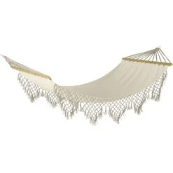 Ein ebenso gemütliches wie dekoratives Plätzchen für den Außenbereich stellt die beigefarbene Hängematte Salcha dar. Mit Ihr können Sie eine komfortable Liegefläche in Ihrem Garten, auf der Terrasse oder auf dem Balkon realisieren. Darüber hinaus ist die Hängematte ebenso für den Innenbereich geeignet. Sie ist im neutralen Beige gehalten, das mit vielen Innen- und Außengestaltungen harmoniert. Als Blickfang fungieren dabei die dekorativ herabhängenden Seitenvolants in gehäkeltem Gittermuster.
