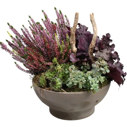 Mit diesem Arrangement kommt wunderschöne Herbststimmung auf. Es ist mit Heide (Calluna), Fetthenne (Sedum) und Purpurglöckchen (Heuchera) bepflanzt und eignet sich hervorragend für die Verschönerung von der Fensterbank, dem Balkon oder der Terrasse.