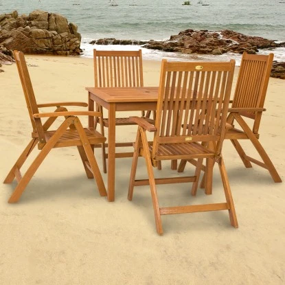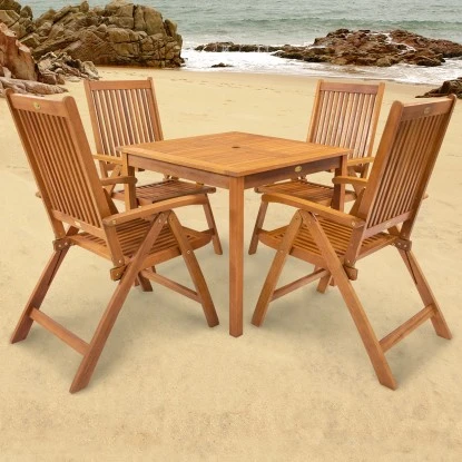 Dieses Gartenmöbelset Bangor von indoba® bietet Platz für vier Personen. Dieses Gartenmöbel erfreut Sie durch sein witterungsbeständiges Holz mit einer langen Lebensdauer. Das Set besteht aus vier Hochlehner Stühlen und einem Quadratischen Gartentisch. Eine Öffnung für den Sonnenschirm befindet sich in der Mitte der Tischplatte. Die Rückenlehne der Hochlehner ist fünffach verstellbar. Die Gartenstühle lassen sich für eine einfache und platzsparende Lagerung einfach zusammenklappen. Alle Komponenten dieser Gartengarnitur sind mit Teaköl vorbehandelt.