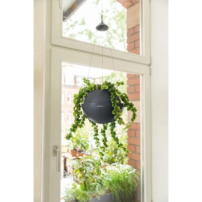 Die Lechuza Hängeampel Bola Color 23 Schiefergrau Ø 23 cm ist ein Pflanzgefäß, das mit seinem integrierten Bewässerungssystem besticht. Das Gefäß ist schnell bepflanzt und leicht zu befestigen. Die mitgelieferte Edelstahlaufhängung ist rostfrei und trägt die Pflanzen sicher. Die feine Rillenstruktur erzeugt spannende Kontraste zur glatten Oberfläche. Mit Bola Color kann man seine Pflanzen in luftiger Höhe in Szene setzen.