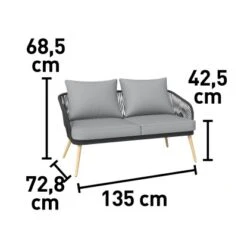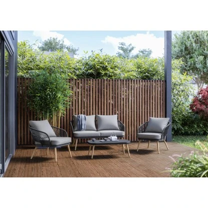 Das 4-teilige Lounge-Set Edna dient als komfortable Sitzgruppe für den Balkon, die Terrasse oder den Garten. Es besteht aus einem 2-Sitzer-Sofa, zwei Sesseln und einem Tisch. Insgesamt finden hier vier Personen Platz. Der rechteckige Loungetisch besitzt abgerundete Kanten und ist mit einer getönten Glasplatte in Dunkelgrau ausgestattet. Als Material kommt ein robustes Stahlgestell mit einer Seilbespannung zum Einsatz. Während Bespannung und Rahmen in Anthrazit gehalten sind, weisen die Beine eine helle Holzoptik auf. Im Lieferumfang enthalten sind ebenfalls passende Auflagen und Rückenkissen. Ihr Bezug besteht aus beigefarbenem Polyspun. Die Gartengruppe stellt eine Sitzhöhe von 42,5 cm zur Verfügung.
