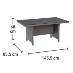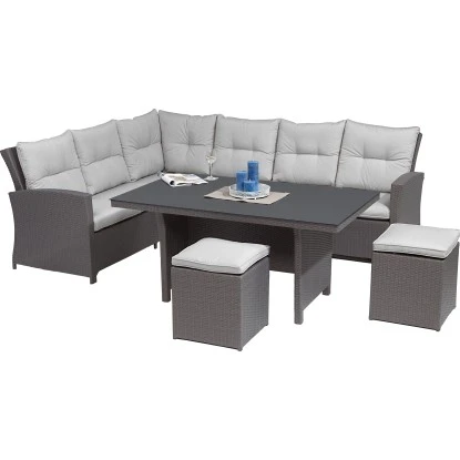 Das 5-teiligeLounge-Set mit Esstisch der Serie Vermont mit einer Eckbank links lädt zum Relaxen und gemütlichen Beisammensitzen ein. Die Gartenmöbelgruppe besticht durch ihr hochwertiges Material, ihren extra Komfort und ihr stilvolles Design. Dank der cleveren Kombination aus Lounge- und Esstisch-Gruppe eignet sie sich sowohl zum entspannten Verweilen in Ihrem Garten als auch für einen gemeinsamen Grillabend in größerer Runde. Denn Sitzbänke besitzen die praktische Eigenschaft, viel Sitzfläche mit wenig Möbeln zu bieten. Die beiden handlichen Hocker sind flexibel arrangierbar. An dieser Rattangarnitur können bis zu sieben Personen Platz finden. Auch können Sie einen weiteren Gartensessel der Serie Vermont ergänzen (nicht im Lieferumfang enthalten). Zudem verfügt der Tisch über eine angenehme Höhe und ist mit einer pflegeleichten Glasplatte in Grau ausgestattet.