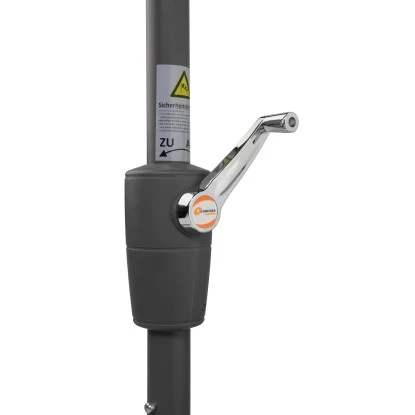 Dank der Kurbelmechanik können Sie den Balkonschirm bequem öffnen und schließen. Aufgespannt besitzt er eine Größe von 150 cm in der Breite und 270 cm in der Tiefe. Um den Schirm auch bei niedrigem Sonnenstand morgens und abends perfekt für einen idealen Schattenplatz ausrichten zu können, lässt er sich am Mast abknicken bzw. neigen. Die maximale Höhe des Sonnenschirms beträgt 250 cm.