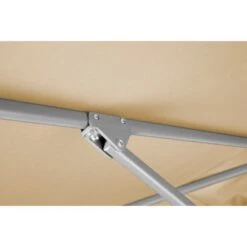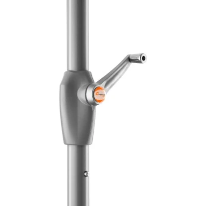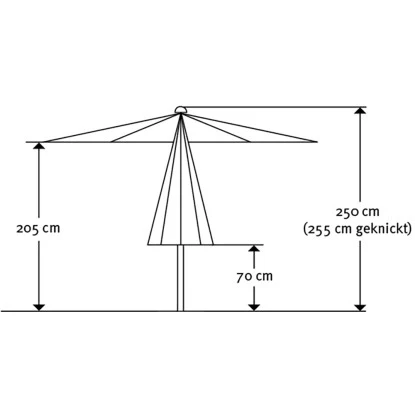 Das Gestell hat eine silbergraue Pulverbeschichtung. Der Stock hat einen stabilen Durchmesser von ca. 38 mm und ist zweiteilig, wodurch Sie den Schirm problemlos auseinanderbauen und über den Winter platzsparend einlagern können. Mithilfe der integrierten Kurbel lässt sich der Schirm ohne großen Kraftaufwand Öffnen und Schließen. Durch einfaches „Weiterdrehen“ der Kurbel knickt der Schirm und bietet damit optimalen Schatten. Die Gesamthöhe des aufgestellten Schirmes beträgt ca. 250 cm, mit einer Durchgangshöhe von ca. 205 cm. Im geknickten Zustand beträgt die Gesamthöhe ca. 255 cm.