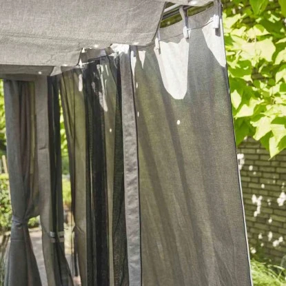 Der Siena Garden Vorhang mit Insektenschutz für Schattenmanufaktur misst 300 cm x 210 cm x 210 cm und besteht aus pulverbeschichtetem Stahl in der Farbe Anthrazit. Die Gardinenstange und der Vorhang sind zweigeteilt. Die Teile sind aus 100 % Polypropylen gefertigt und in der Farbe Anthrazit. Das Moskitonetz ist zweigeteilt und aus 100 % Polyester in Schwarz. Beides lässt sich mittig mit einem Reißverschluss verschließen. Das doppelläufige Vorhangsystem schützt Sie sowohl vor neugierigen Blicken als auch vor Insekten. Dank des eingebauten Moskitonetzes können Sie lange Sommerabende ausklingen lassen, während die Vorhänge sanft im Wind wehen und eine besonders gemütliche Atmosphäre kreieren.
